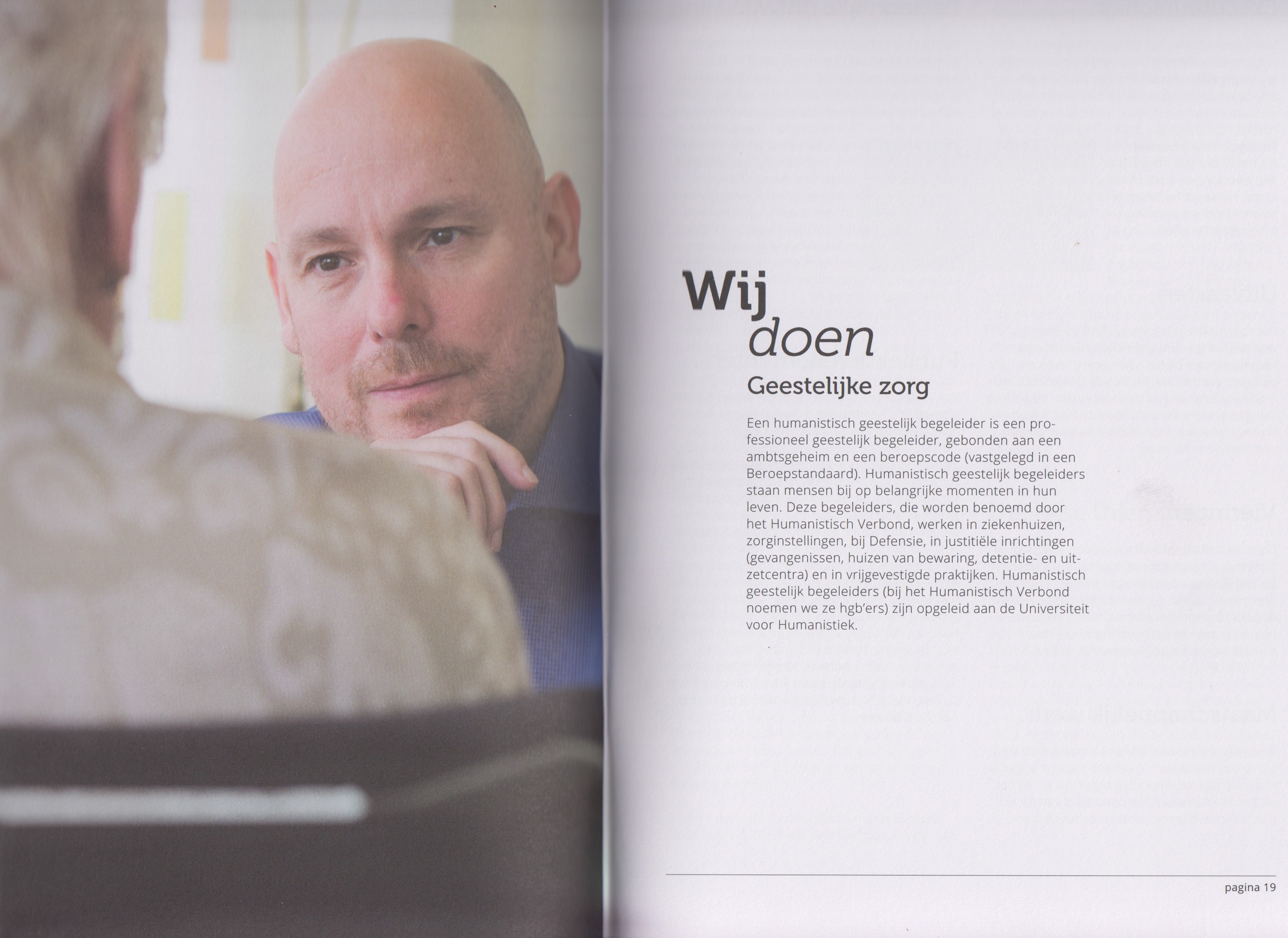 Voor de nieuwe brochure van het Humanistisch Verbond (Alles wat u wilt weten over het Humanistisch Verbond) heeft fotograaf Johannes Abeling enkele foto’s van mij gemaakt tijdens mijn werk. Eén foto is in de brochure terechtgekomen. Hieronder de pagina’s uit de brochure en daaronder de originele foto van Abeling. Zie voor meer werk van Abeling: hier.