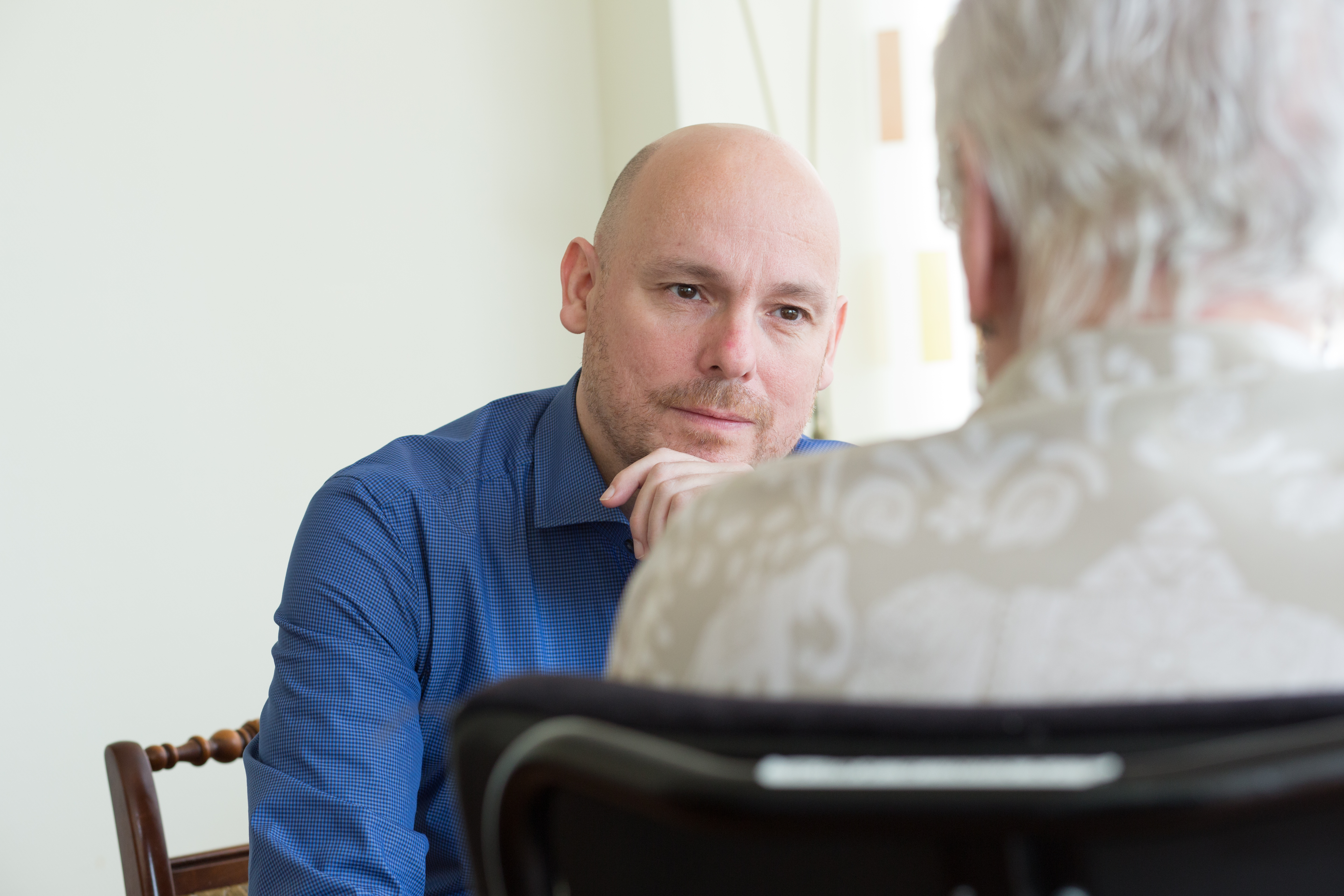 Amstelveen, 28-04-2015. Humanistisch Geestelijk Begeleider Eric de Rooij aan het werk in woonzorgtehuis De Groenelaan. Foto: Johannes Abeling
