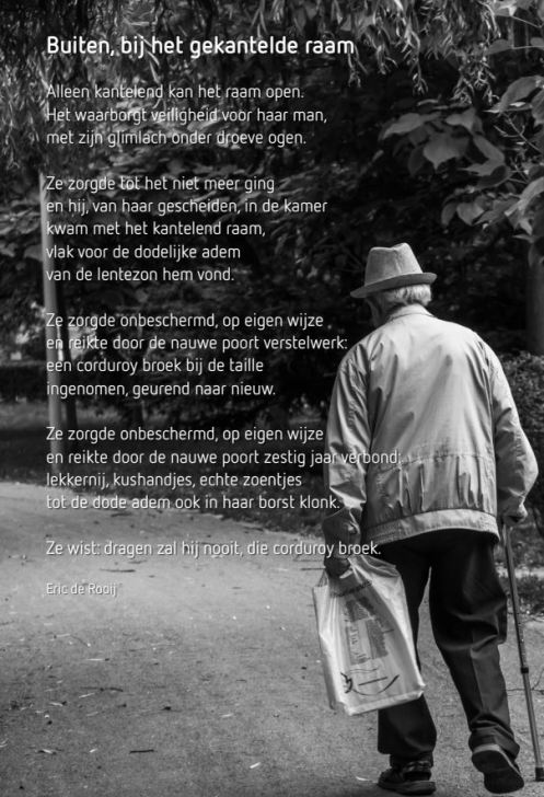 Buiten, bij het gekantelde raam is een anekdotisch gedicht. Een man met dementie is opgenomen in een verpleeghuis, op een afdeling waar je alleen met een code binnen kunt komen. Elke dag zoekt zijn vrouw hem op, tot het verpleeghuis vanwege corona op slot gaat. Ook hij blijkt ziek te zijn. Quarantaine op zijn kamer. De deur dicht. Nog meer opgesloten. Hij heeft het kleine beetje geluk dat hij op de begane grond woont, nabij de tuin, zodat zijn vrouw hem aan het raam kan bezoeken. Hoort hij haar wel als ze, met haar mond dicht bij het glas, iets zegt? En hij kijkt zo droef. Ze wil hem graag iets geven. Ze vraagt hem het raam te openen. Vanwege veiligheid kan het raam alleen kantelend open. De tekst wordt geïllustreerd met een stockfoto…