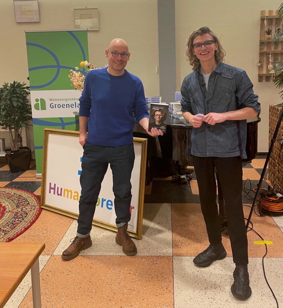 Hij stapt het verpleeghuis binnen met een Perzisch kleedje over zijn schouder. Onder zijn arm een groot bord #Humanforever en in zijn hand een vaas met kleurige nepbloemen. Met zijn andere hand probeert hij een mondkapje achter zijn oren te klemmen. Teun Toebes. Twintiger. Rank. Zijn krullen vallen breed op zijn schouders. In november verscheen van hem Verpleegthuis. Wat ik leer van mijn huisgenoten met dementie. Op de vleugel in de grote zaal staan zijn boeken opgestapeld. Meer dan honderd. Hij zal ze die middag allemaal signeren in het hanenpoothandschrift van een linkshandige. Ik omklem mijn pen op nagenoeg dezelfde manier.