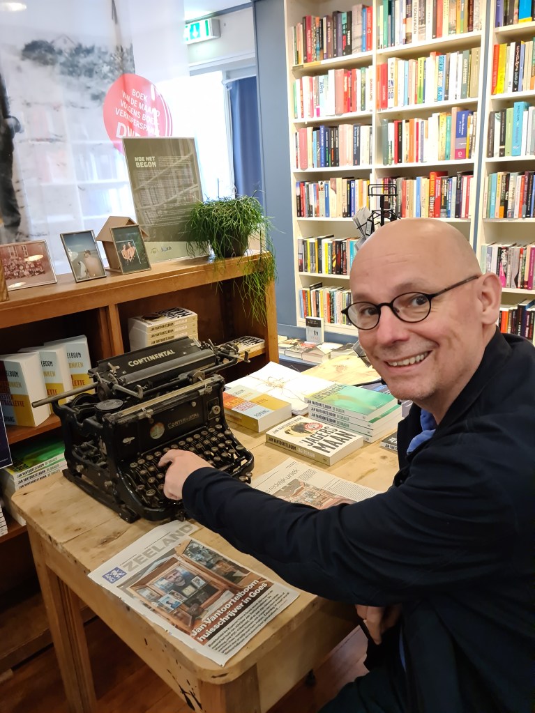 Leuk detail: één van de foto’s is gemaakt in boekhandel De Koperen Tuin in Goes, ik zit achter de typemachine van schrijver Jan Vantoortelboom (zijn boeken liggen ook op het bureau). De foto van de krantenpagina is gemaakt door mijn Zeeuwse schoonmoeder. 😉